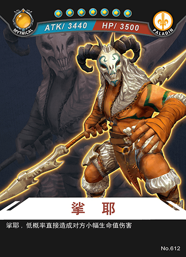 游侠 传说 七星 卡牌编号 No.612 卡牌介绍 戴着古怪的羊头面具,手持一把尖骨刺枪,战斗时能准确击中敌人的弱点造成巨大伤害,只凭自己的喜好行事,被他教训过的混混们都叫他街头霸王,据说真名叫秦明哲。 技能描述 ★弱点攻击:每次攻击有10%的概率直接减少敌方25%当前血量。
