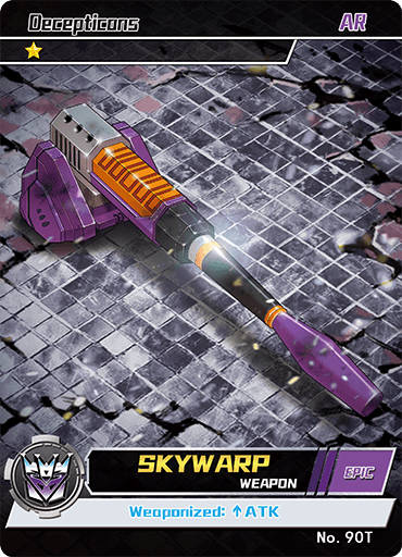 Decepticon Epic 1 Strength Point Card Number No.90T Card Introduction Use Skywarp’s weapon to increase his attacking force. Skill Description ★Skywarp·Weapon:Attacking force will be increased by 15%. Associated Heroes SKYWARP·BOT MODE