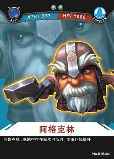 王国 稀有 二星 卡牌编号 No.516 卡牌介绍 智慧先知赫尔巴斯的护卫仆从,忠心耿耿,主人若是受伤,他会强化自身的防御能力,顶在最前方吸收伤害。 技能描述 ★坚固药剂:赫尔巴斯战败后,阿格克林登场时提高100%防御。 关联卡牌 赫尔巴斯